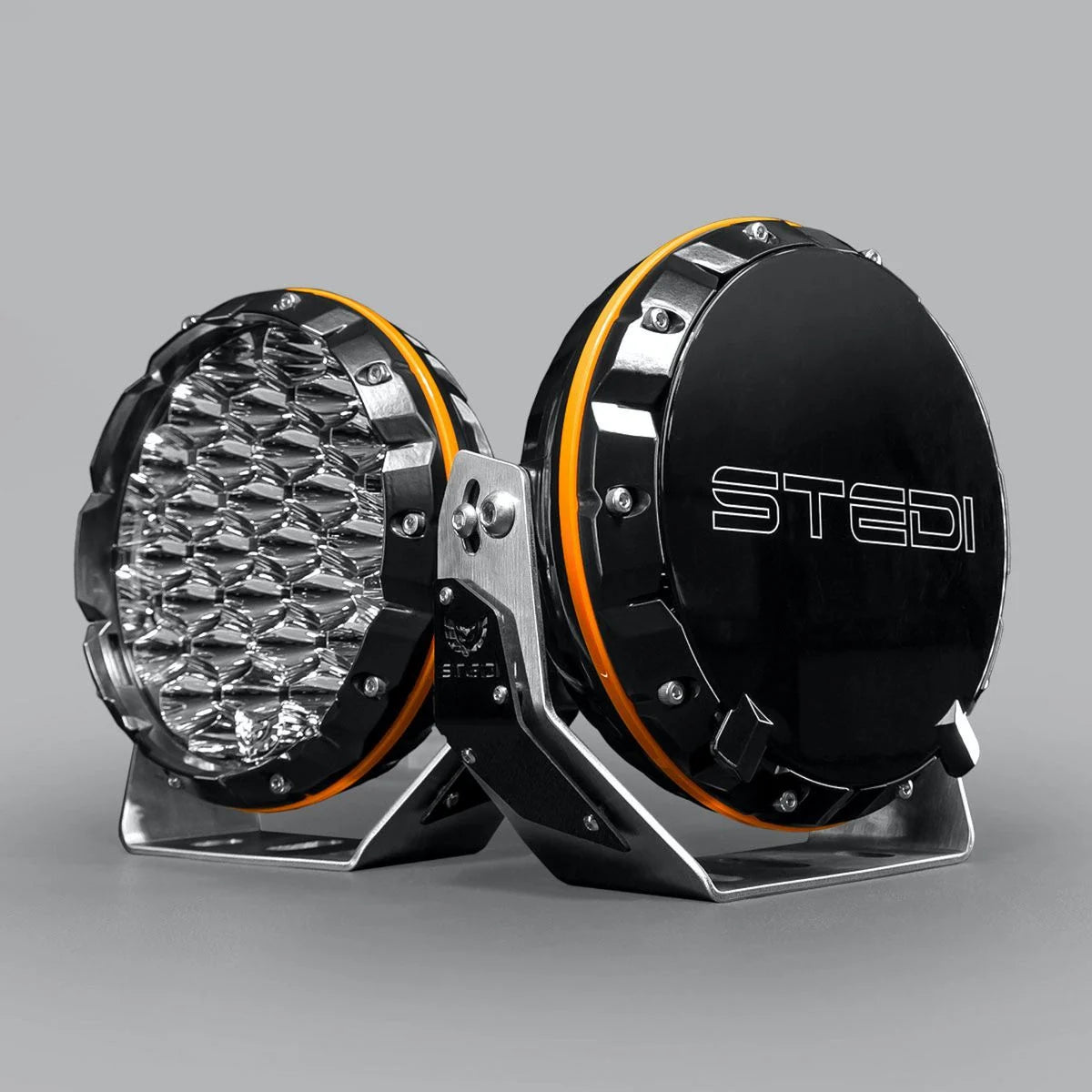 Stedi obsessed over even the most trivial geometries and design elements to achieve a visually stunning luminaire. The 4mm 304 Stainless steel bracket features signature shoulder armour with laser-cut STEDI™ branding. A carefully considered orange rim surrounding the housing offers just the right amount of visual impact while ensuring that the overall look and feel play nicely equally on a Sandy Taupe Landcruiser as it will on a Magnetic Grey Ranger.